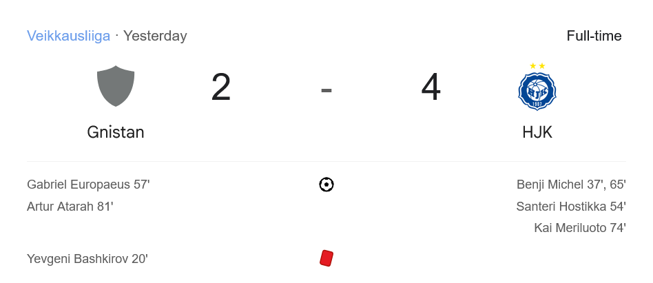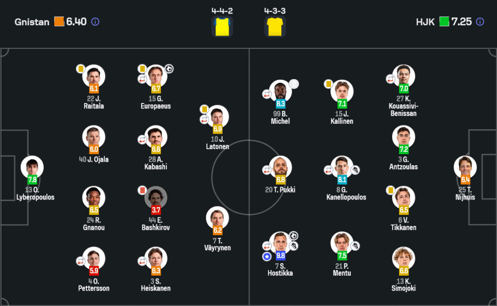 วิเคราะห์บอล เกมนี้ Gnistan ที่เหลือผู้เล่นเพียง 10 คนตั้งแต่นาทีที่ 20 ทำให้แผน 4-4-2 ต้องถูกบีบให้ตั้งรับลึกเกือบตลอดทั้งเกม แม้มีความพยายามในการสวนกลับจาก แวร์ยิเนน และ อาตาราห์ แต่ขาดการสนับสนุนจากแดนกลาง ขณะที่แนวรับต้องแบกภาระหนักตลอด 90 นาที จนมีช่องให้ HJK เจาะซ้ำหลายระลอก