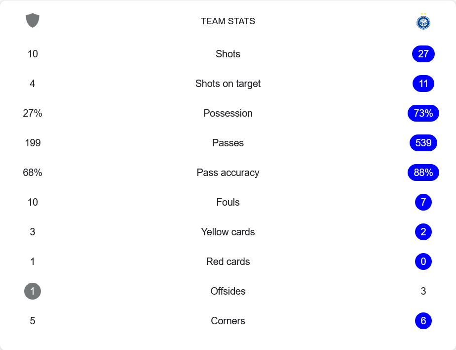 HJK ครองบอลถึง 73% เทียบกับเพียง 27% ของเจ้าถิ่น Gnistan โดยสร้างโอกาสยิงมากถึง 27 ครั้ง และยิงตรงกรอบถึง 11 ครั้ง ต่างจากเจ้าบ้านที่มีโอกาสยิงเพียง 10 ครั้ง และเข้ากรอบเพียง 4 หน จำนวนการผ่านบอลก็ห่างกันมากถึง 539 ต่อ 199 ครั้ง โดย HJK มีความแม่นยำถึง 88% ส่วน Gnistan อยู่ที่เพียง 68% แสดงให้เห็นถึงความแตกต่างด้านคุณภาพเกมที่ชัดเจน ใบเหลืองเกมนี้เกิดขึ้น 5 ใบ แบ่งเป็นฝั่งเจ้าบ้าน 3 ใบ และทีมเยือน 2 ใบ