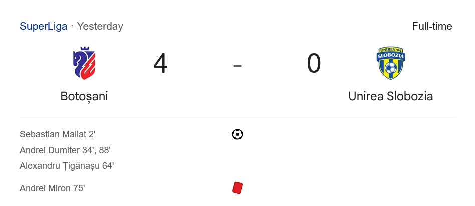 ศึกฟุตบอล โรมาเนีย ลีกา 1 คืนที่ผ่านมาร้อนฉ่าไม่แพ้แดดยามบ่าย เมื่อ โบโตซานี่ เปิดบ้านไล่กระหน่ำใส่ โซลโบเซีย แบบไม่ไว้หน้า 4-0 โดยมี อังเดร ดุมิเตอร์ รับบทพระเอกทั้งยิงทั้งจ่าย จัดคนเดียวสองตุงและหนึ่งแอสซิสต์ พาเจ้าบ้านคว้าสามแต้มในเกมที่พวกเขาเหลือผู้เล่น 10 คนช่วงท้ายครึ่งหลัง บ้านกีฬา ขอสรุปทุกจังหวะสำคัญ และเกาะติด ผลบอลสด คู่นี้แบบเข้มข้นที่สุด