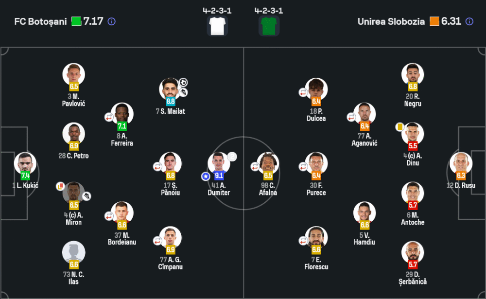 • กองกลาง: เอ. เฟร์ไรรา (7.1), เอ. ปาโนยู (6.8), เอ. จี. ซิมปานู (6.9), เอ. ดุมิเตอร์ (9.1), เซบาสเตียน ไมลาต (8.8)