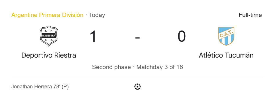 ศึกฟุตบอล อาร์เจนติน่า พรีเมียร์ดิวิชั่น คืนที่ผ่านมา ดวลกันเดือดระหว่าง เดปอร์ติโบ เรยสตาร์ ที่เปิดบ้านรับการมาเยือนของ แอตเลติโก ทูคูแมน โดยผลการแข่งขันจาก บ้านผลบอล เผยว่า เจ้าถิ่นเรยสตาร์เบียดชนะหวุดหวิด 1-0 จากประตูชัยของ โจนาธาน เฮอร์เรร่า ที่ซัดจุดโทษเข้าไปในนาที 78 แม้ทูคูแมนจะครองบอลเหนือกว่าแต่สุดท้ายต้องกลับบ้านมือเปล่า