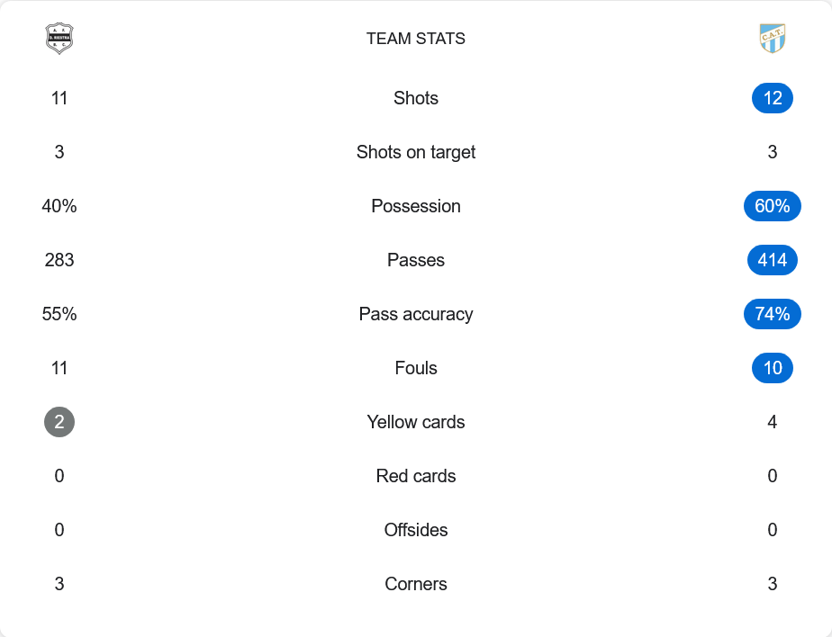 เกมนี้แอตเลติโก ทูคูแมนครองบอลเหนือกว่าที่ 60% และจ่ายบอลสำเร็จถึง 74% เทียบกับเรยสตาร์ที่มีเพียง 55% ทว่าด้วยรูปแบบการเล่นที่เน้นรับเหนียวแน่นของเรยสตาร์ ทำให้แม้จะยิงน้อยกว่าเล็กน้อย (11 ครั้งเทียบกับ 12 ครั้งของทูคูแมน) แต่ก็ได้ประตูสำคัญ ขณะที่ทั้งสองทีมมีโอกาสยิงตรงกรอบเท่ากันที่ 3 ครั้ง แต่เจ้าบ้านมีความเฉียบขาดมากกว่า สุดท้ายแม้จะโดนแรงกดดันช่วงท้าย เรยสตาร์ก็ปิดเกมด้วยความแน่นอน