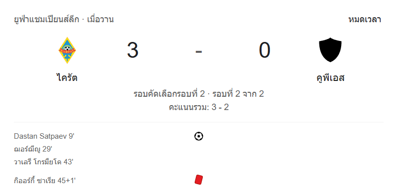 - หมดเวลา: ไครัต 3-0 คูพีเอส