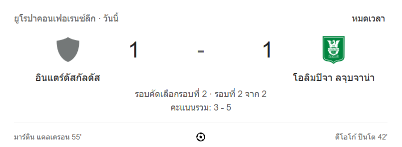 - หมดเวลา: อินเตอร์ดิสคัลดัส 1-1 โอลิมปิยา ลูบลายาน่า
