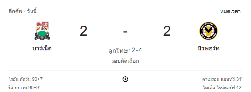 - จบ 90 นาที: บาร์เน็ต 2-2 นิวพอร์ต ต้องตัดสินด้วยการยิงจุดโทษ