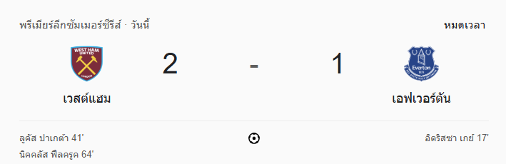 - หมดเวลา: เวสต์แฮม ยูไนเต็ด 2-1 เอฟเวอร์ตัน