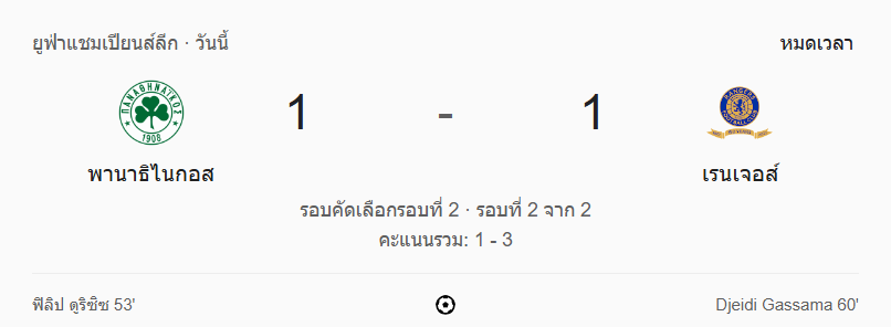 - หมดเวลา: พานาธิไนกอส 1-1 เรนเจอร์ส