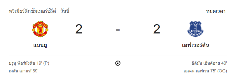 - นาทีที่ 75: OG! เอฟเวอร์ตันตีเสมอ 2-2 จากจังหวะ เอเดน เฮฟไวน์ (แมนยู) ทำเข้าประตูตัวเอง