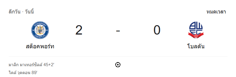 - จบครึ่งแรก: สต็อคพอร์ทนำ 1-0 โบลตันยังมีโอกาสในครึ่งหลัง