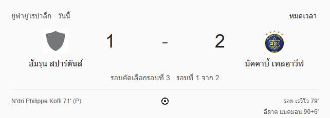 - จบเกม: ฮัมรุน สปาร์ตันส์ 1-2 มัคคาบี้ เทลอาวีฟมัคคาบี้ เทลอาวีฟ บุกคว้าชัยในช่วงทดเจ็บสุดดราม่า!