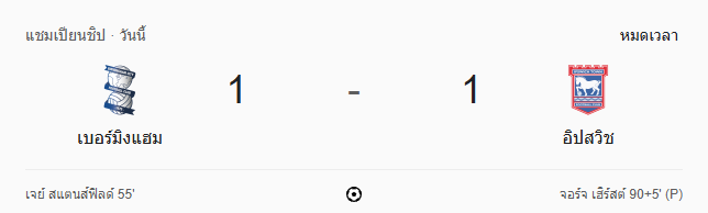 • หมดเวลา: เบอร์มิงแฮม ซิตี้ 1-1 อิปสวิช ทาวน์