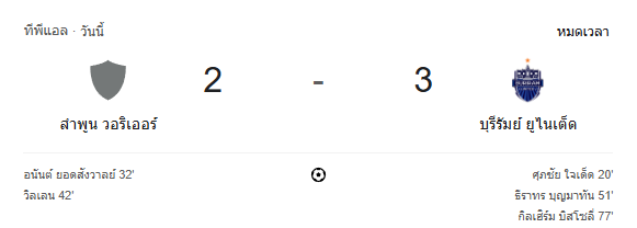 ในศึก BYD Sealion 6 League 1 เมื่อวันที่ 16 สิงหาคม 2568 แฟนบอลได้ชมเกมระดับไฟลุกระหว่าง ลำพูน วอร์ริเออร์ เปิดบ้านรับการมาเยือนของ บุรีรัมย์ ยูไนเต็ด ผลการแข่งขันจบลงด้วยสกอร์ บุรีรัมย์ ยูไนเต็ด บุกคว้าชัย 3-2 อย่างสุดดราม่า บ้านกีฬาเก็บ ผลบอลสด รายงานทุกช็อตสำคัญอย่างครบถ้วน