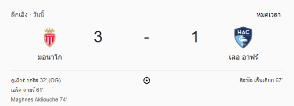 - หมดเวลา: โมนาโก 3-1 เลอ อาฟร์ — เจ้าบ้านเก็บสามแต้มได้อย่างมั่นใจ