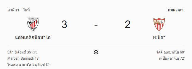 - นาทีที่ 99: หมดเวลาการแข่งขัน — บิลเบาเช็กบิลเซบียา 3-2 เก็บสามแต้มสุดระทึกต่อหน้าแฟนบอลในซาน มาเมส