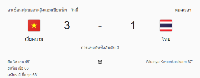 การแข่งขัน อาเซียนฟุตบอลหญิงแชมเปียนชิพ นัดชิงอันดับ 3 ระหว่าง ทีมชาติเวียดนามหญิง พบกับ ทีมชาติไทยหญิง จบลงด้วยชัยชนะของเวียดนาม 3-1 บ้านกีฬา ขอนำเสนอ ผลบอลสด สุดเข้มข้น ที่แฟนบอลห้ามพลาด เพราะเกมนี้เต็มไปด้วยจังหวะมันส์สะใจและเหตุการณ์สำคัญที่ทำให้แฟนบอลลุกจากเก้าอี้แทบไม่ทัน!