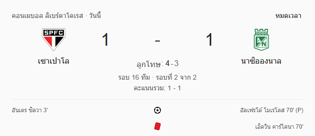 บ้านกีฬา พาเกาะติด ผลบอลสด ศึกฟุตบอลถ้วยใหญ่ของทวีปอเมริกาใต้ “โกปา ลิเบร์ตาโดเรส” รอบ 16 ทีมสุดท้าย นัดที่สอง ระหว่าง เซาเปาโล เปิดสนามเอสตาดิโอ ซิเซโร ปอมเปว เด โตเลโด ต้อนรับการมาเยือนของ อัตเลติโก นาซิอองนาล เมเดลลิน เกมนี้ดุเดือดเข้มข้นจนต้องวัดกันถึงการดวลจุดโทษ ก่อนที่เจ้าถิ่นจะเป็นฝ่ายกุมชัย