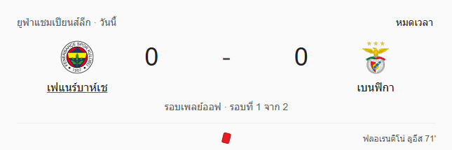 - จบเกม: เฟเนร์บาห์เช่ทำได้เพียง เสมอ 0-0 กับเบนฟิก้า ทั้งที่ทีมเยือนเหลือ 10 คนตั้งแต่นาที 71 ต้องไปลุ้นกันต่อในเลกสอง — เกมนี้สองผู้รักษาประตู Trubin และ เอกริบายัต เซฟอุตลุตจนสกอร์นิ่งสนิท