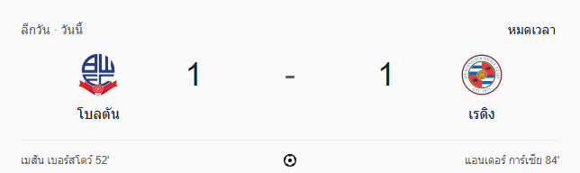 ผลบอลสด ลีกวัน อังกฤษ คู่ระหว่าง โบลตัน วอนเดอเรอส์ เปิดบ้านเสมอกับ เร้ดดิ้ง ไปอย่างดุเดือด 1-1 เกมนี้เต็มไปด้วยจังหวะเข้มข้นทั้งสองฝั่ง โดยมีประตูสำคัญเกิดขึ้นในครึ่งหลัง ที่ทำให้แฟนบอลลุ้นกันจนวินาทีสุดท้าย