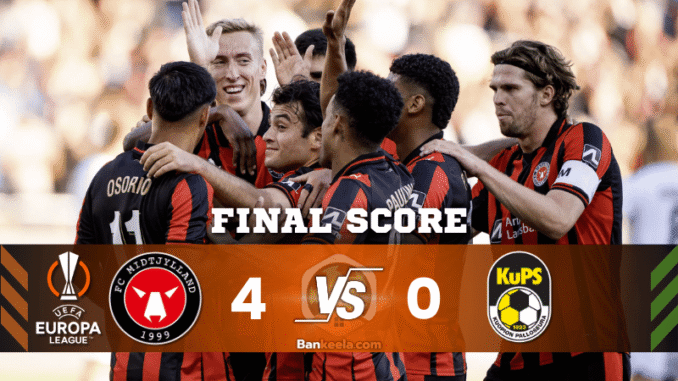 ศึก ยูฟ่ายูโรปาลีก รอบเพลย์ออฟ เลกแรก ที่เดนมาร์ก เจ้าถิ่น มิดทิลแลนด์ โชว์ฟอร์มดุดัน ไล่อัด คูพีเอส 4-0 บ้านกีฬาอัปเดตแบบ ผลบอลสด นาทีต่อนาที คมทั้งจังหวะเข้าทำและเด็ดขาดในช่วงท้ายเกม