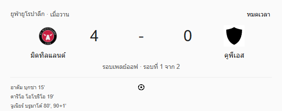- นาทีที่ 90+4 – หมดเวลา: มิดทิลแลนด์ชนะคูพีเอส 4-0 กุมความได้เปรียบชัดเจนในเลกแรก