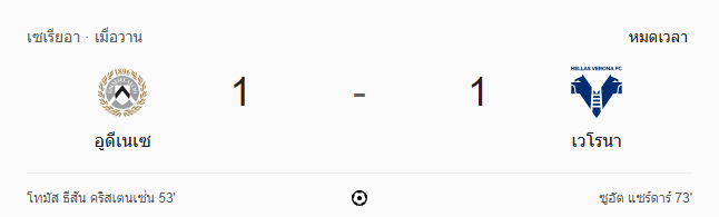 - นาทีที่ 95: จบเกม! อูดิเนเซ่ เสมอ เวโรน่า 1-1 แบ่งแต้มกันไป