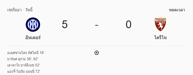 - นาทีที่ 90: กรรมการไม่ทดเวลาพิเศษ จบเกม อินเตอร์ มิลาน ถล่ม โตริโน่ 5-0