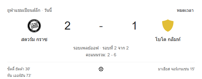 บ้านกีฬา รายงานผล ผลบอล ยูฟ่าแชมเปียนส์ลีก รอบเพลย์ออฟ นัดสอง สตวร์ม กราซ เปิดบ้านอัดใจแฟนบอลด้วยชัยชนะ 2-1 เหนือ โบโด/กลิมท์ แต่เมื่อคิดสกอร์รวมสองนัดยังเป็นทีมจากนอร์เวย์ที่ผ่านเข้ารอบด้วยผลรวม 6-2