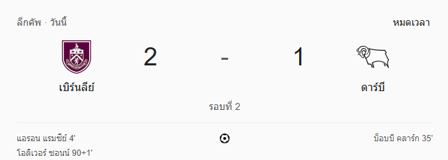 - หมดเวลา: เบิร์นลีย์ เฉือนชนะดาร์บี้ 2-1 ผ่านเข้าสู่รอบต่อไปได้สำเร็จ