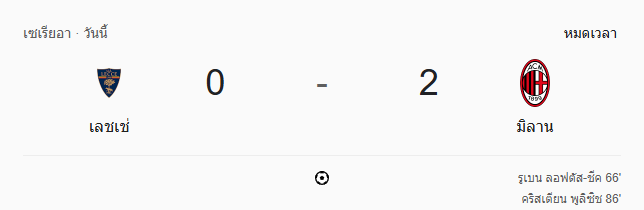- หมดเวลา: เลชเช่ 0-2 เอซี มิลาน มิลานคว้า 3 แต้มสำคัญด้วยเกมรุกเฉียบคมในครึ่งหลัง ปิดบัญชีด้วย Loftus-Cheek และ Pulisic