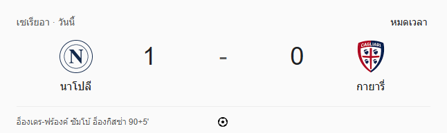 - นาทีที่ 90+7: หมดเวลาการแข่งขัน: นาโปลี 1-0 กายารี่ เจ้าบ้านคว้า 3 แต้มแบบดราม่าท้ายเกม! จากประตูชัยของ Anguissa ในช่วงทดเจ็บพาทีมขึ้นแรงกิ้งต่อเนื่อง