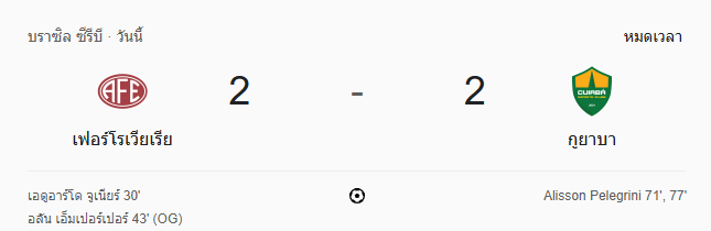 - หมดเวลา: เฟอร์โรเวียเรีย 2-2 กุยาบา แบ่งแต้มสุดมัน! โดยเฉพาะในช่วงครึ่งหลังที่เกมเปิดหน้าแลกกันเต็มที่