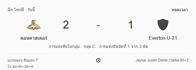 ศึกฟุตบอล อีเอฟแอล โทรฟี กลุ่ม C นัดเปิดสนาม เดือดเกินคาด! ดอนคาสเตอร์ เปิดบ้านเฉือนชนะ เอฟเวอร์ตัน U-21 ไปแบบสุดมัน 2-1 โดยเกมนี้มีจังหวะดราม่าท้ายเกมแบบนั่งไม่ติดเก้าอี้ ผู้เล่นอย่าง โจ สบาร์ร่า และ จัสติน คลาร์ก กลายเป็นพระเอก-ผู้ร้ายในเวลาไล่เลี่ยกัน พร้อมทั้งแทรก ผลบอลสด ที่เปลี่ยนทุกนาทีให้ลุ้นระทึกถึงวินาทีสุดท้าย!