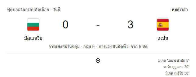 - หมดเวลาการแข่งขัน: บัลแกเรีย 0-3 สเปน