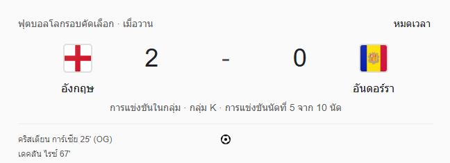 - นาทีที่ 94: จบเกม! อังกฤษ 2-0 อันดอร์รา ทัพสิงโตคำรามคว้าชัยแบบไม่เสียประตู เก็บ 3 แต้มสำคัญในศึกคัดบอลโลกกลุ่ม K