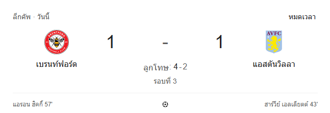 รายงานการแข่งขัน: เบรนท์ฟอร์ด 1(4) – 1(2) แอสตัน วิลล่า