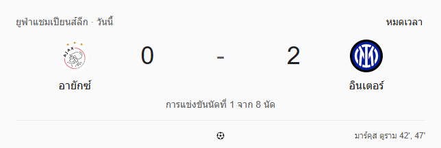 - หมดเวลา: อินเตอร์ มิลาน บุกชนะ อาแจ็กซ์ 2-0