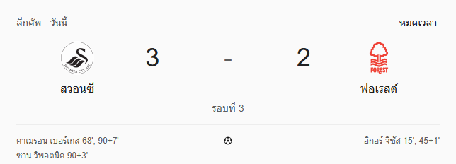 ศึกอีเอฟแอลคัพรอบ 3 เมื่อคืนที่ผ่านมา บ้านกีฬา ขอนำเสนอ ผลบอลสด ที่สุดดราม่า เมื่อ สวอนซี ซิตี้ เปิดบ้านแซงเฉือนเอาชนะ น็อตติ้งแฮม ฟอเรสต์ 3-2 หลังตามหลังไปก่อน 0-2 เกมนี้เต็มไปด้วยความเข้มข้น นาทีต่อนาที จนแฟนบอลหายใจไม่ทั่วท้อง