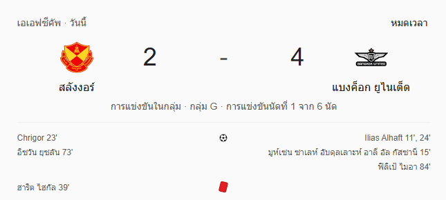 - หมดเวลา: สกอร์จบลงที่ สลังงอร์ 2-4 แบงค็อก ยูไนเต็ด