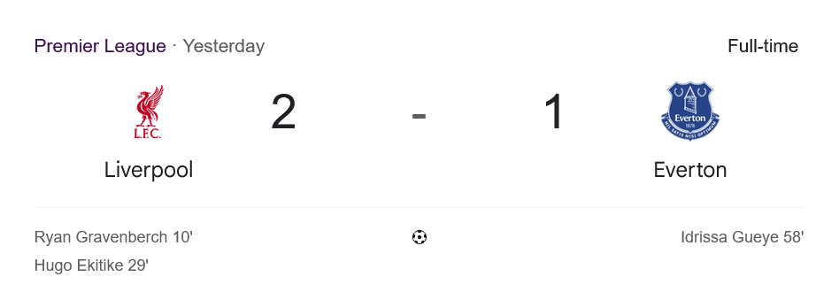 ชัยชนะครั้งนี้ทำให้ ลิเวอร์พูล เก็บ 15 คะแนนเต็มจาก 5 นัด ยึดจ่าฝูงอย่างสง่างาม ส่วน เอฟเวอร์ตัน หล่นไปอยู่อันดับ 9 มีเพียง 7 คะแนน ฟอร์มยังไม่นิ่งและต้องเร่งเก็บแต้มเพื่อเบียดหัวตาราง