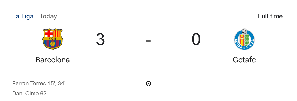ศึก ลาลีกา สเปน เกมนี้แฟนบอลได้ลุ้นตั้งแต่นาทีแรก และตามรายงาน บ้านผลบอล ผลการแข่งขันจบลงด้วยสกอร์ 3-0 ให้เจ้าบุญทุ่ม บาร์เซโลน่าเหนือกว่าแบบชัดเจน เปิดฉากครึ่งแรก เจ้าบ้านครองเกมได้ดุดัน กดดันตั้งแต่แดนกลาง ก่อนจะมาได้ประตูนำเร็ว นาทีที่ 15 จากจังหวะประสานงานสุดเนียน ดานี่ โอลโม่ แทงทะลุให้ เฟร์ราน ตอร์เรส ซัดเต็มข้อไม่เหลือ 1-0 ต่อมานาทีที่ 34 ตอร์เรสคนเดิมอาศัยความเฉียบคมซัดเบิ้ลช่วยให้บาร์ซ่าหนีเป็น 2-0 ก่อนจบครึ่งแรก บาร์ซ่าครองบอล 62% สร้างสรรค์เกมรุกได้เนียนกว่าเกตาเฟ่ชัดเจน