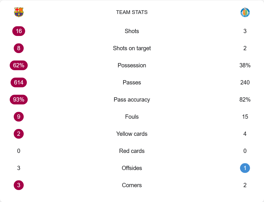 เกมนี้แสดงให้เห็นถึงความเหนือกว่าของบาร์เซโลน่าอย่างชัดเจน พวกเขามีโอกาสยิงถึง 16 ครั้ง เข้ากรอบ 8 ครั้ง ส่วนเกตาเฟ่มีเพียง 3 ครั้งเท่านั้น การครองบอลของบาร์ซ่าสูงถึง 62% ผ่านบอลมากกว่า 600 ครั้ง และแม่นยำถึง 93% ขณะที่เกตาเฟ่ครองบอลได้เพียง 38% ผ่านบอล 240 ครั้ง ความดุดันของบาร์ซ่ายังเห็นได้จากการไล่เพรสที่บังคับให้เกตาเฟ่ต้องฟาวล์ถึง 15 ครั้ง และโดนใบเหลือง 4 ใบ