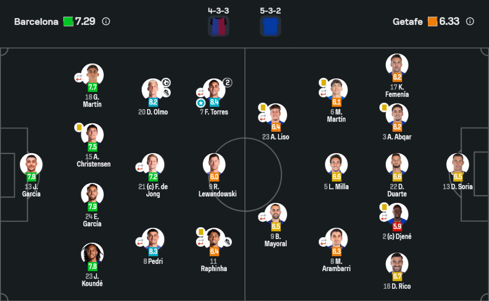 เฟร์ราน ตอร์เรส คือพระเอกของเกมนี้ ทำ 2 ประตูสำคัญและสร้างโอกาสต่อเนื่อง ได้คะแนนสูงถึง 8.4 กลายเป็นตัวทีเด็ดที่พาบาร์เซโลน่าปิดเกมตั้งแต่ครึ่งแรก ขณะที่ดานี่ โอลโม่ก็โชว์ฟอร์มยอดเยี่ยม ทำไป 1 ประตูและควบคุมจังหวะเกมแดนกลางได้อย่างเหนือชั้น