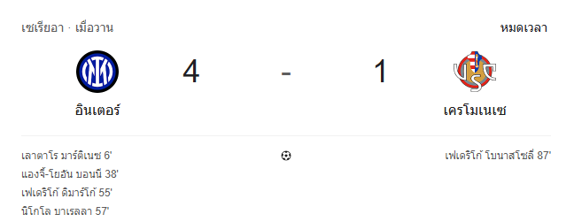 ผลบอลสด เซเรียอา ระหว่าง อินเตอร์ มิลาน vs เครโมเนเซ่ วันนี้ 4/10/68 ดูบอลย้อนหลัง คลิปไฮไลท์ ดูบอล เซเรียอา