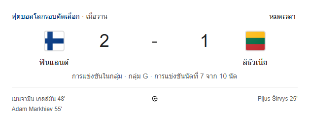 - 🔔 หมดเวลา: ฟินแลนด์เฉือนชนะ ลิทัวเนีย 2–1 คว้าสามแต้มสำคัญในบ้านหลังโดนยิงนำก่อน