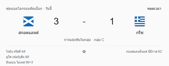 - หมดเวลา: สกอตแลนด์เอาชนะ กรีซ 3–1 พลิกจากตามหลังกลับมาซิวสามแต้มสุดมันส์ต่อหน้าแฟนบอลในบ้าน!