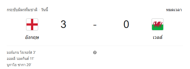 นาทีที่ 90+3: มีจังหวะแฮนด์บอลของทั้งสองทีมติดต่อกัน แต่ไม่มีผลต่อเกม - หมดเวลา: อังกฤษโชว์ฟอร์มเหนือชั้น ถล่ม เวลส์ 3–0 จากสามประตูในครึ่งแรกของ โรเจอร์ส, วัตกินส์ และ ซาก้า คว้าชัยอย่างสวยงามในเกมอุ่นเครื่องนี้