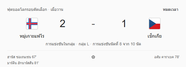 ผลบอลสด ฟุตบอลโลก รอบคัดเลือก โซนยุโรป ระหว่าง หมู่เกาะแฟโร vs สาธารณรัฐเช็ก วันนี้ 12/10/68 ดูบอลย้อนหลัง คลิปไฮไลท์ ดูบอล ฟุตบอลโลก รอบคัดเลือก โซนยุโรป