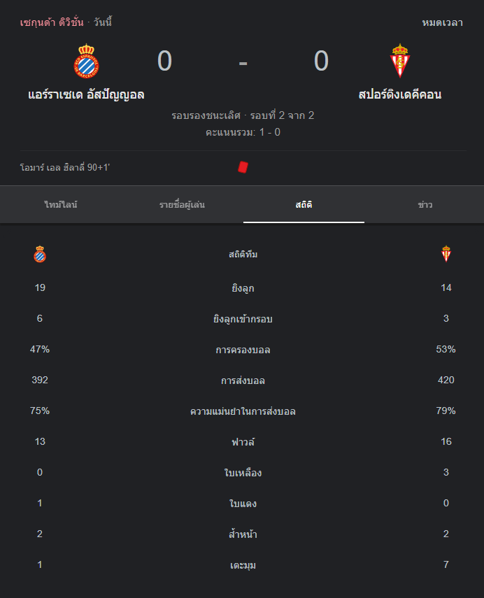 ผลบอลสดวันนี้ การแข่งขัน เซกุนด้า ดิวิชั่น เอสปันญ่อล 0-0 สปอร์ติ้ง กิฆอน