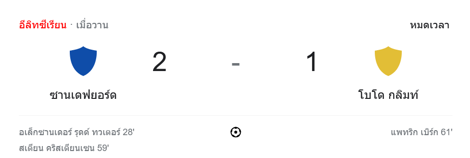 ผลบอลนอร์เวย์ ทิปเปลีเก้น 2024 ซานเดฟยอร์ด 2-1 โบโด กลิมท์ 14/7/67