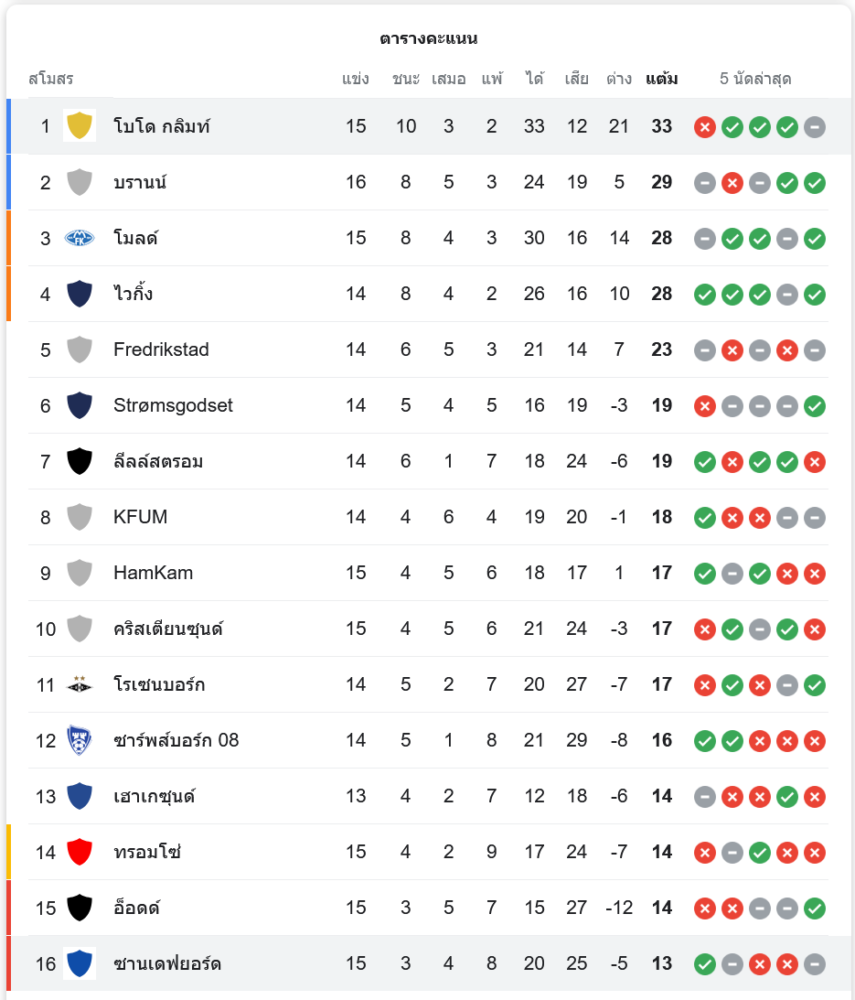 • Fredrikstad: แข่ง 14 นัด ชนะ 6 นัด เสมอ 3 นัด แพ้ 5 นัด (21 คะแนน)